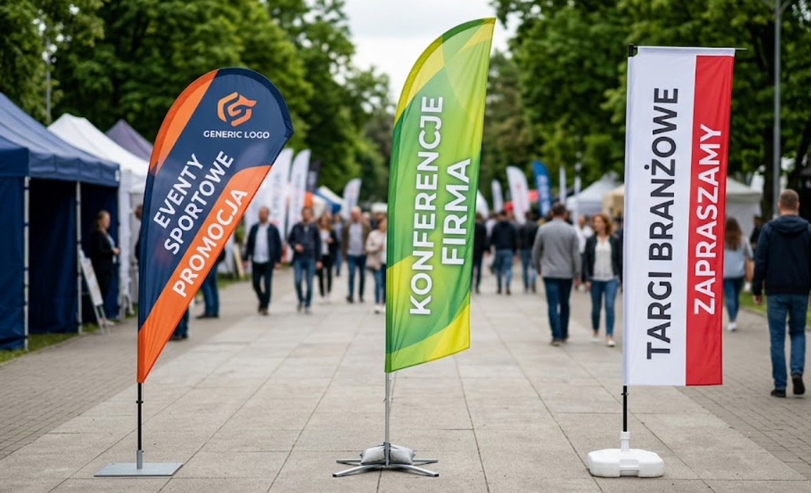 W przestrzeniach zamkniętych flagi reklamowe nie są narażone na działanie warunków atmosferycznych, co pozwala na stosowanie lżejszych podstaw i większych formatów bez obaw o stabilność. Wewnątrz budynków można wykorzystać wszystkie rozmiary flag, również największe formaty XL, ponieważ nie występuje tutaj problem silnego wiatru. W halach targowych, centrach kongresowych i galeriach handlowych beachflagi sprawdzają się jako element oznakowania stoisk, punktów informacyjnych oraz stref tematycznych. Do użytku wewnętrznego wystarczają lżejsze podstawy – płaskie lub krzyżak.