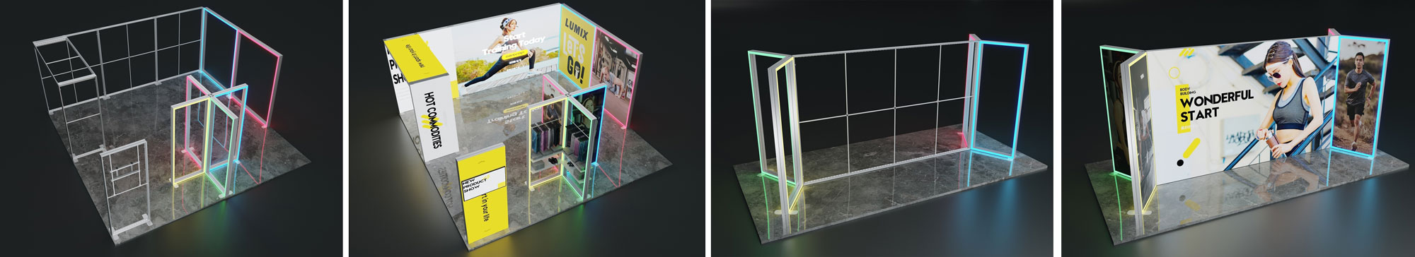 Modułowa konstrukcja pozwala na łączenie ścianek Lumix™ RGB ze sobą za pomocą specjalnych konektorów. System można również łączyć z rozwiązaniami Lumix™, tworząc spektakularne, podświetlane zabudowy targowe o różnych konfiguracjach. Przykłady połączeń znajdziesz w galerii zdjęć.
